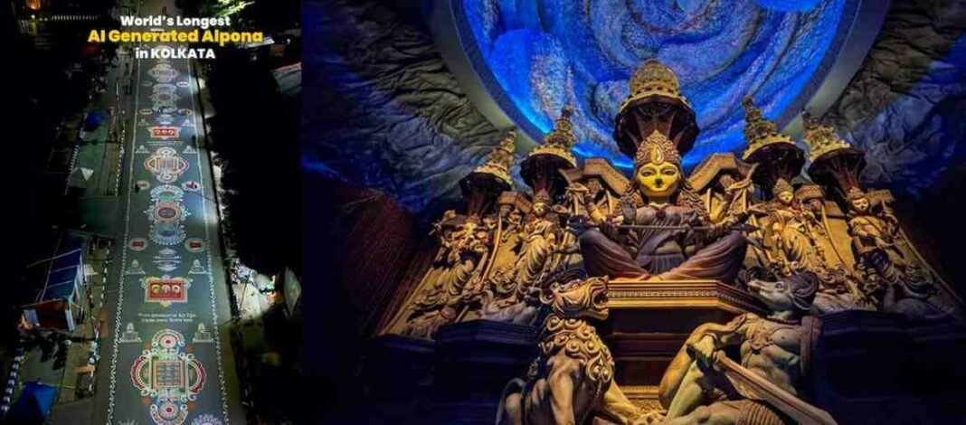 In Newtown, a 500-foot-long alpana has been unveiled, marking one of the largest ever attempted for Durga Puja. Covering nearly 13,000 square feet, the artwork was completed in just five days by a team of 20 dedicated painters led by artist Anindita Deb. The concept was digitally designed by artist Suvranil Nath using artificial intelligence (AI), blending traditional artistry with modern technology.
